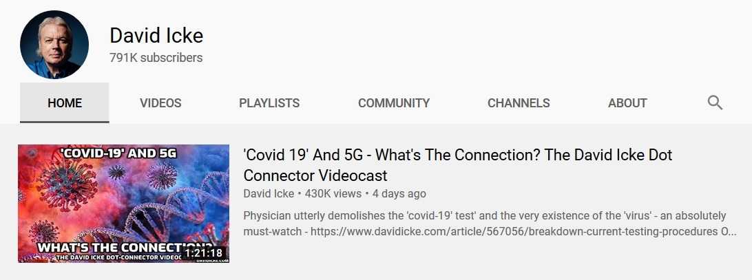 Теории о связи 5G и эпидемии распространяются и на видеохостинге YouTube. Так, соответствующее видео на эту тему 3 апреля на своём канале разместил популярный британский конспиролог Дэвид Айк.