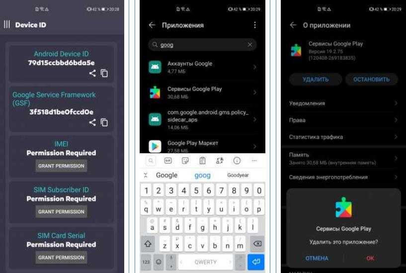 Открываем Google Play и скачиваем через него приложение «Device ID». Запускаем его, жмем кнопку «Grant Permission», а затем заходим в настройки смартфона и отключаем Google-сервисы. Далее устанавливаем apk-файл из папки (перед установкой включите режим «В самолете»). Наконец, снова заходим в Device ID и смотрим, отсутствует ли надпись «Google Service Framework». Если ее нет, то Гугл-сервисы будут работать в полном объеме за исключением Google Pay.