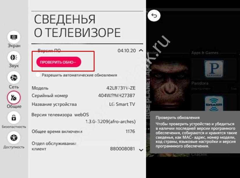 Сложность состоит в поиске программы. Необходимо найти подходящее ПО для устранения ошибки сертификата безопасности LG на Смарт ТВ о том, что сервер недействителен. Для корректного поиска нужного софт зайдите в раздел «Информация о продукте / услуге», а в открывшемся меню посмотрите интересующие сведения — модель и серию, а также полную версию ПО. В категории «ПО и драйверы» на сайте LG введите в строку «Номер модели» числа и буквы, которые соответствуют вашему ТВ, а после загрузите нужный файл. Дальнейшие шаги рассмотрены выше.