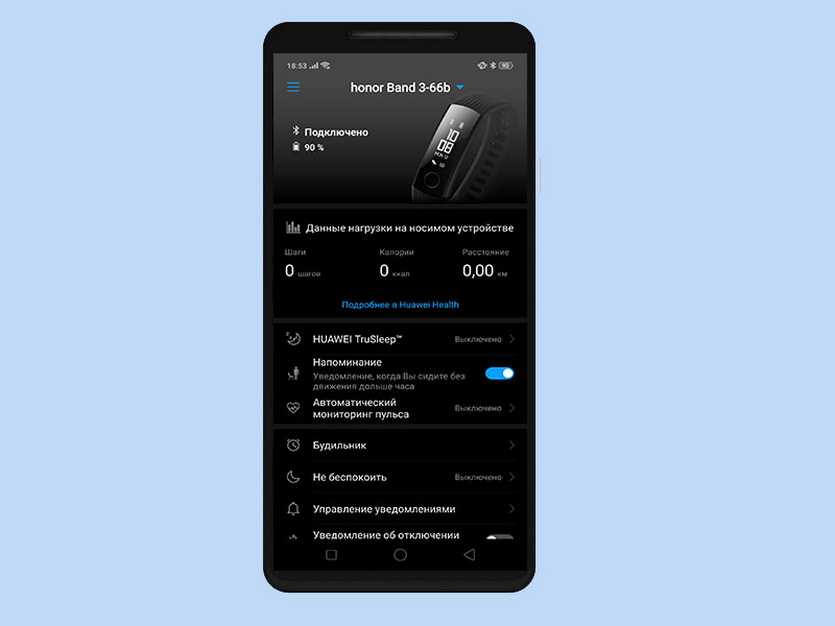 Собственных возможностей Honor Band хватает, чтобы показывать время, количество пройденных шагов, измерять по нажатию клавиши пульс и вызывать меню тренировок с подробным отслеживанием статистики.