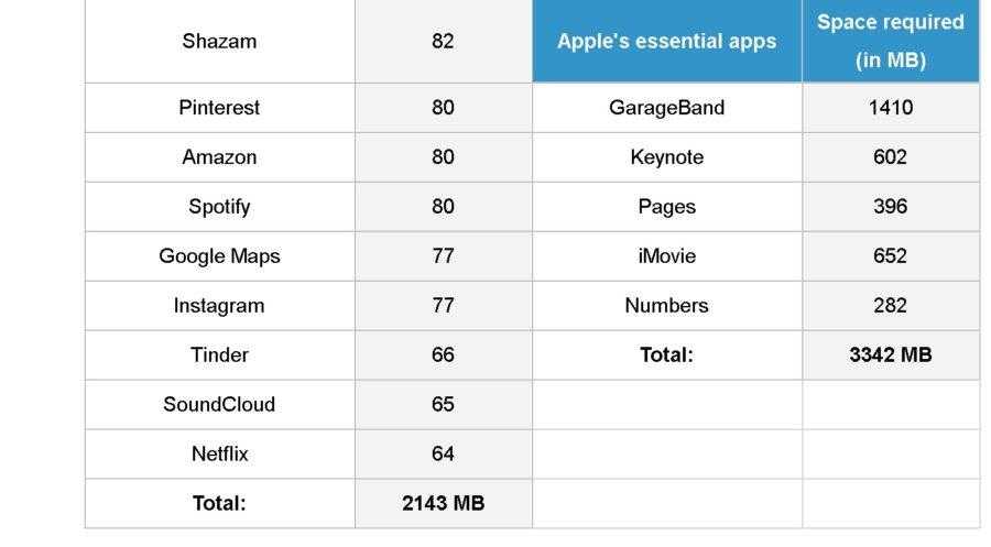 Разумеется, цифры меняются, но мы знаем цифры для некоторых самых популярных приложений для iOS. Например, собственный комплект iLife от Apple (включая GarageBand для создания музыки и iMovie для редактирования видео) занимает около 2 ГБ памяти, а iWork (включая офисные приложения: Страницы, Keynote и Numbers) требует дополнительных 1,3 ГБ. Разумеется, это все дополнительные приложения, но все они нужные.