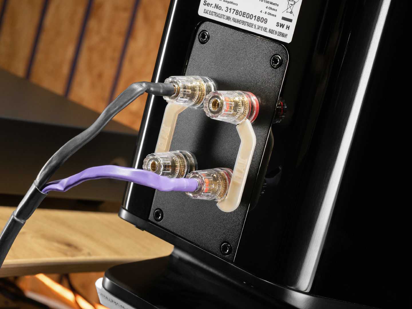 Колонки выпускаются в черном и белом лаке и имеют разъемы для однокабельного подключения