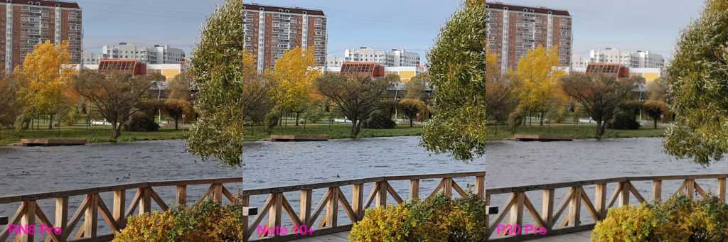 Наибольшую детализацию выдал Redmi Note 8 Pro. Может показаться, что это не так, ведь на фото с Samsung якобы отчётливее видна листва у деревьев. За это отвечают южнокорейские алгоритмы, которые наглухо подавляют шумы вместе со всеми деталями. В результате мелкие объекты объединяются в крупные, весьма грубые, будто акварельные мазки и может показаться, что детализация выше именно у Note 10+. Это не так и последующие примеры покажут это во всей красе.