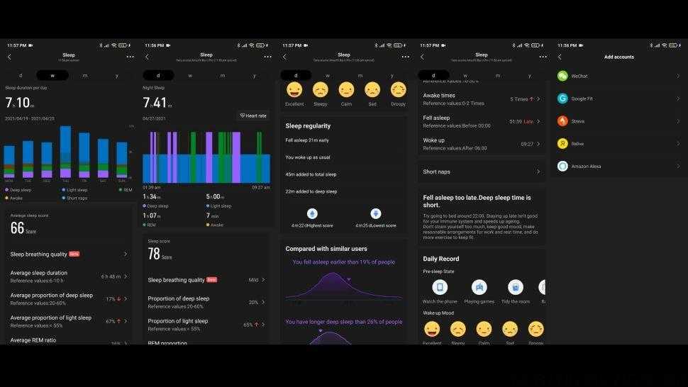 Также часы умеют отслеживать фазы сна, правда к точности работы этой функции возникло больше всего вопросов. Даже при включенном во время сна пульсометре, часы все равно показывали не очень корректной время засыпания или пробуждения. Разница с реальным временем сна порой составляла до полутора часов. Вероятно, это будет исправлено в следующих версиях прошивки. Функции умного будильника нет, часы умеют будить только в строго заданное время. Вибрация достаточно сильная, это кстати, касается и всех других уведомлений.