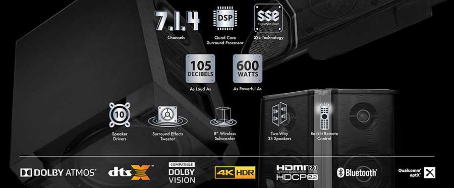 - Расширенный звук: Nakamichi Shockwafe Pro 7.1.4Ch поддерживает некоторые из самых передовых звуковых технологий, доступных сегодня. Фактически, благодаря встроенному четырехъядерному процессору трехмерного объемного звука кинематографического уровня эта система поддерживает: Dolby Atmos, Dolby TrueHD, Dolby Digital Plus, Dolby Digital, DTS: X, DTS-HD Master Audio, DTS- HD и DTS Digital Surround.