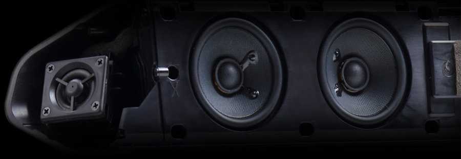 Звуковая панель с семью динамиками с индивидуальным питанием обеспечивает звук на 33% шире. С четырьмя 2,5-дюймовыми полнодиапазонными динамиками, разделенными вдоль левой и правой сторон звуковой панели, двумя 2,5-дюймовыми драйверами центрального канала и одним драйвером на каждом конце звуковой панели для «крайних» левого и правого звуков, окружающих аудиторию качеством аудио.