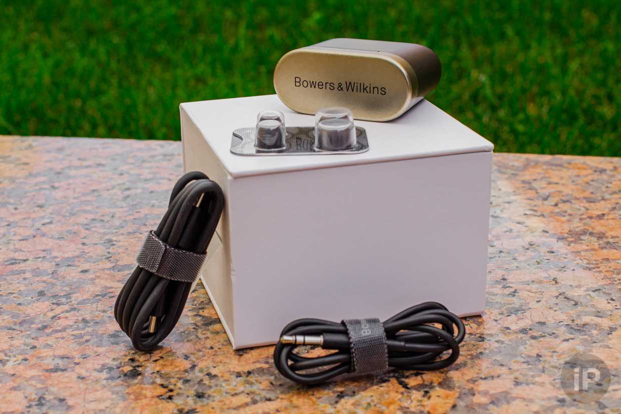 В коробку к Bowers & Wilkins PI7 помимо стандартных инструкции и гарантийного талона кладут два провода и два дополнительных размера силиконовых насадок. Блока питания нет.