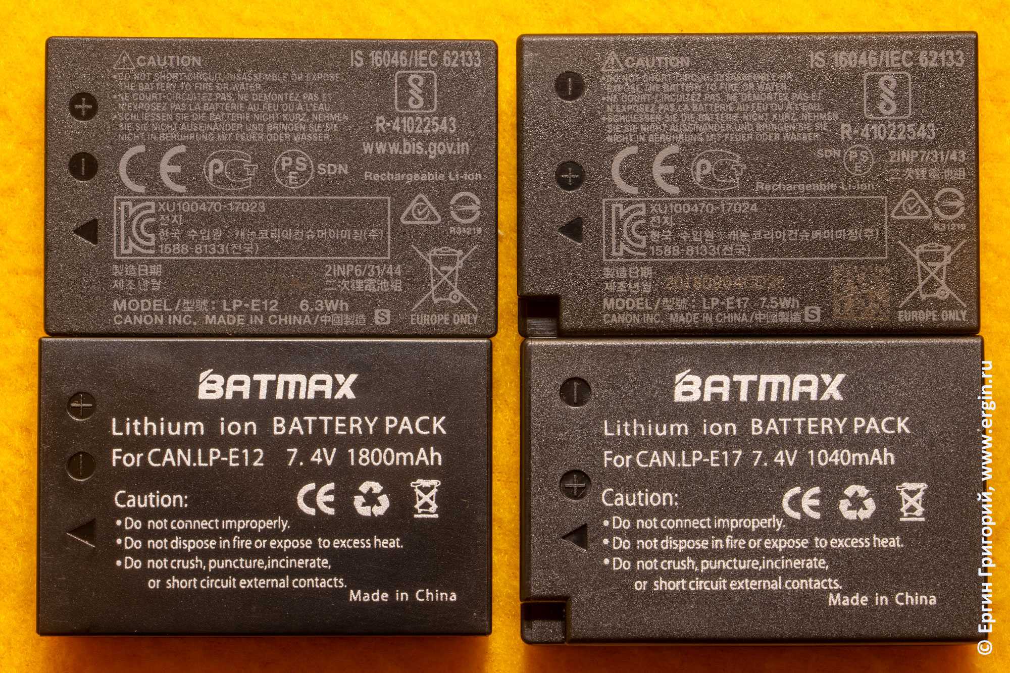 Canon LP-E12 6,3 Wh, 35 г против 13,3 Wh у Batmax — может, ошиблись китайцы с маркировкой?:) 33 г на весах.