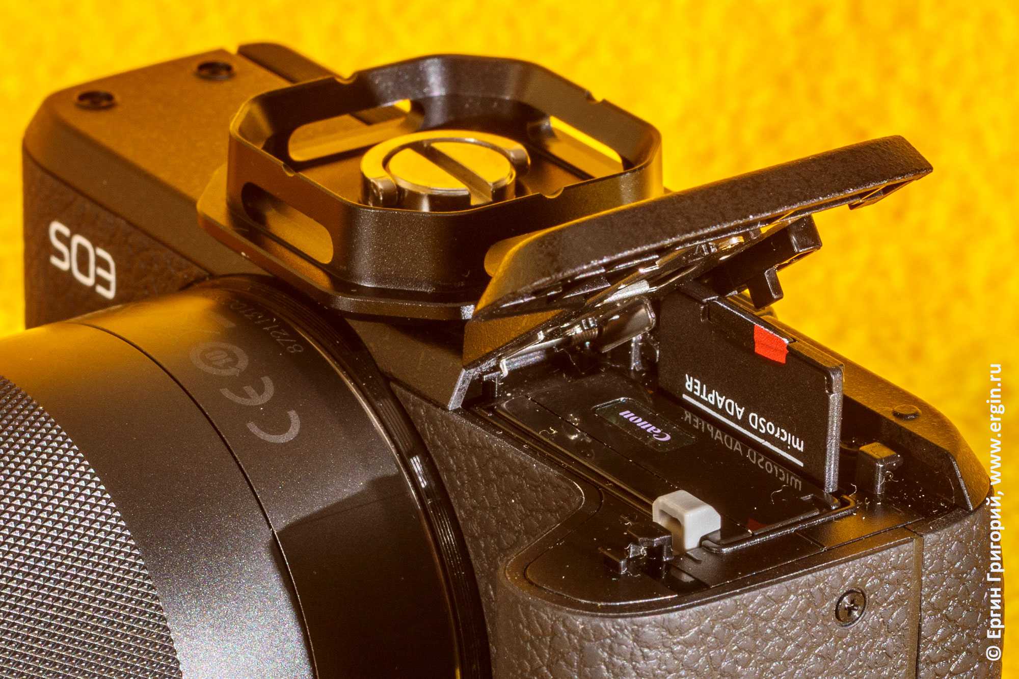 Батарейный отсек Canon EOS M6 Mark 2 и SD-карта памяти, которую нельзя вынуть с накрученной штативной площадкой