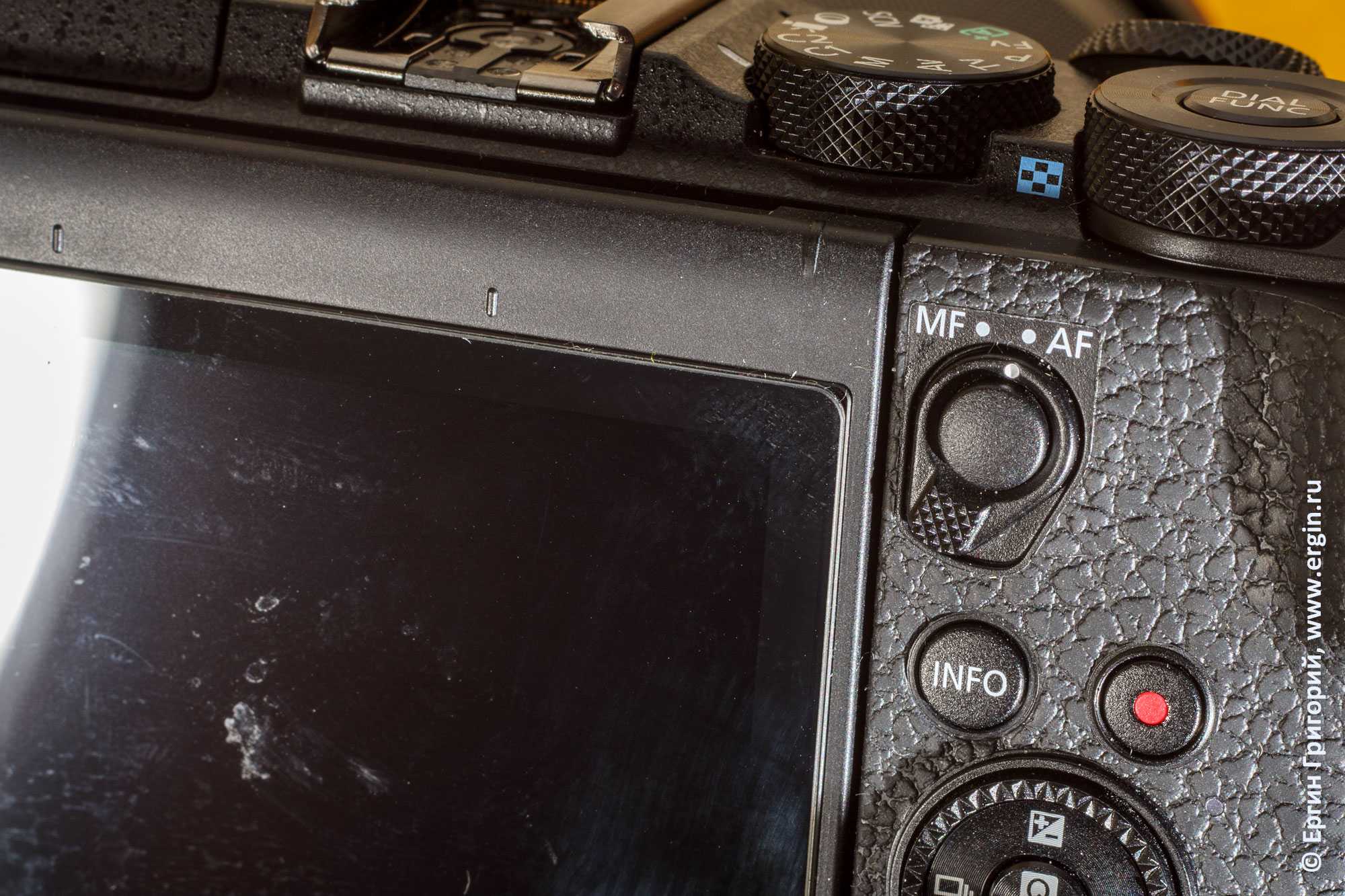 Также есть кнопки для блокировки экспозиции, настройки параметров автофокуса, воспроизведения и удаления фотографий и настройки наложения информации на экране. Плоский диск управления с центральной кнопкой Set завершает задние элементы управления.