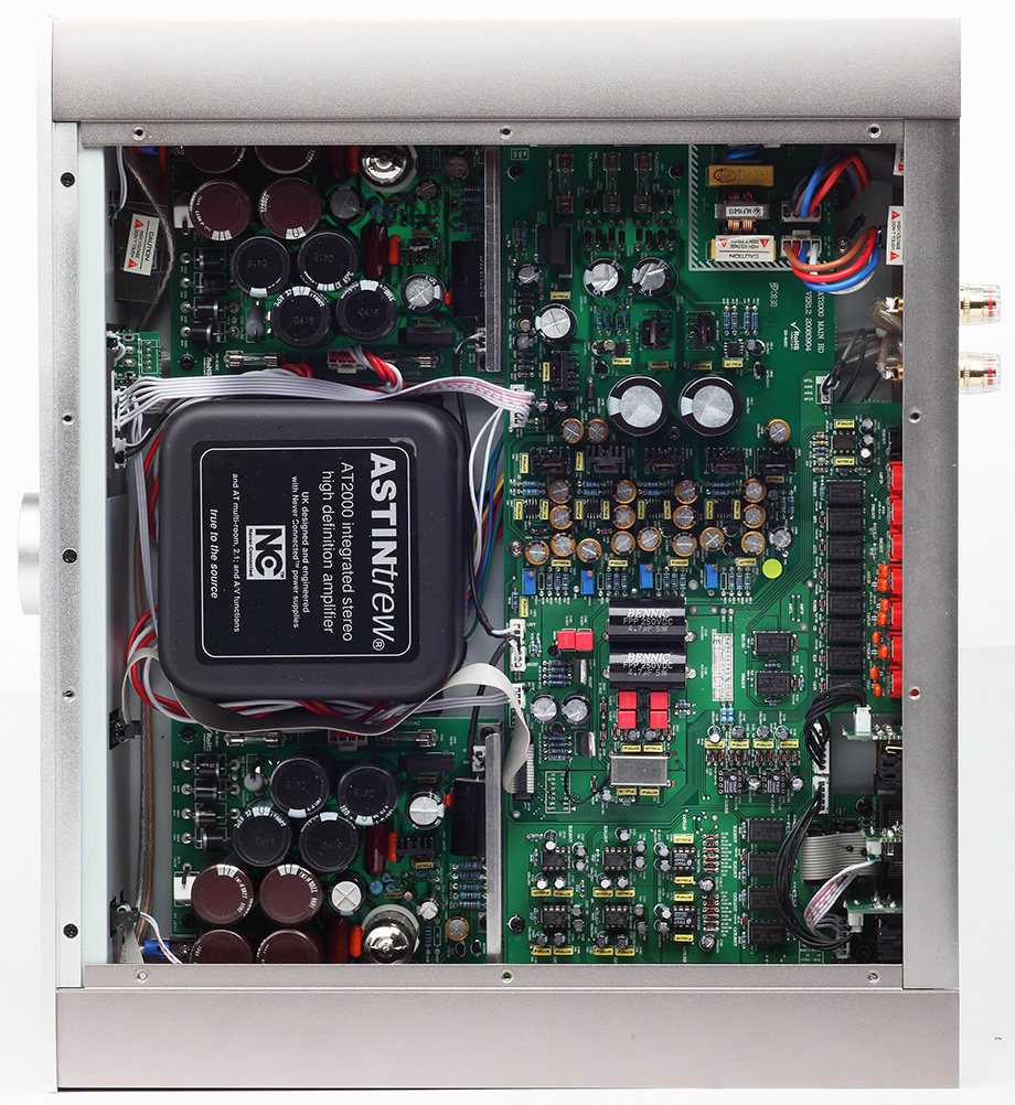 Под капотом усилителя Astin Trew AT2000 рядом с центрально расположенным тороидальным трансформатором в экранированном корпусе — блоки питания с ламповыми регуляторами (используется двойной триод ЕСС82)
