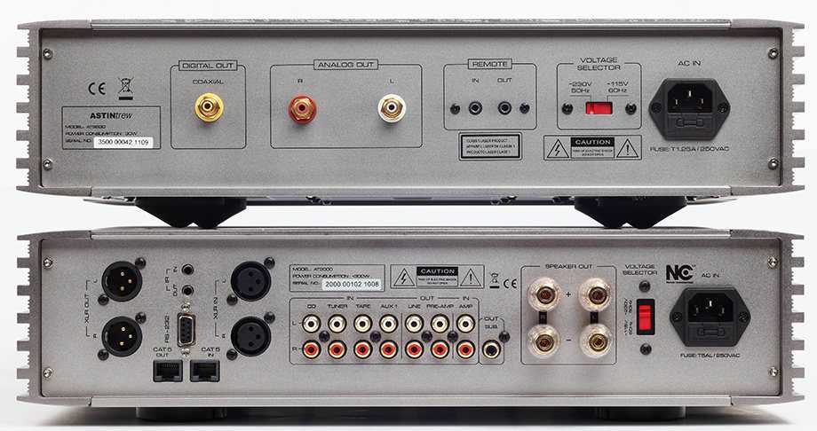 У плеера Astin Trew AT3500 (вверху) спартанский набор выходов — линейный несимметричный и коаксиальный цифровой, реализованные на высококлассных позолоченных клеммах. Усилитель Astin Trew AT2000, помимо традиционного набора несимметричных входов и регулируемого/ нерегулируемого выхода, имеет балансный вход/выход, порт для подключения активного сабвуфера и два гнезда RJ45, озаглавленные САТ5 In и Out