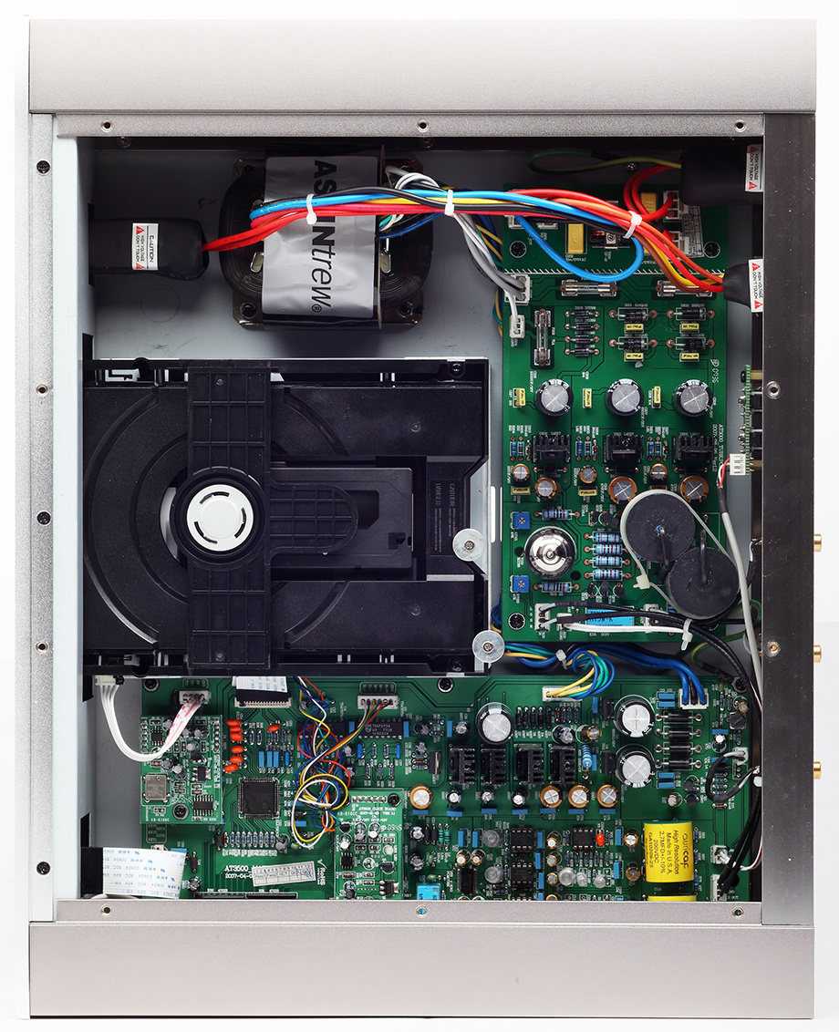 «Внутреннее убранство» плеера Astin Trew AT3500 группируется вокруг транспортного механизма Philips VAM1202. Он отделяет трансформатор, имеющий С-образный сердечник, от платы обработки полезного сигнала