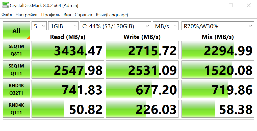 Ноутбук получил SSD на 512 ГБ. Это NVMe PCIe. Вот скорости: