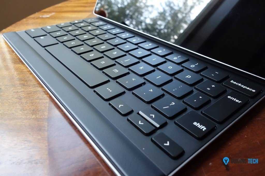 Клавиатура Google Pixel Slate выглядит как чехол у Surface Pro. Она складывается также как клавиатура iPad Smart Keyboard, но имеет оригинальный поворот. Верхний изгиб магнитами крепится к задней части устройства, что позволяет плавно изменять угол наклона одной рукой. Эта клавиатура предлагает отличный опыт набора текста. Несмотря на круглые клавиши текст набирается быстро и удобно, к тому же она очень тихая. Есть подсветка клавиш, но она либо включена, либо выключена, без всяких эффектов.