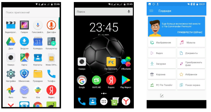 Экран устройства условно делится на три группы: строка состояния, приложения, быстрый доступ. Все это расположено в главном меню. «Из коробки» стоят разные программы, в том числе рекламного характера.