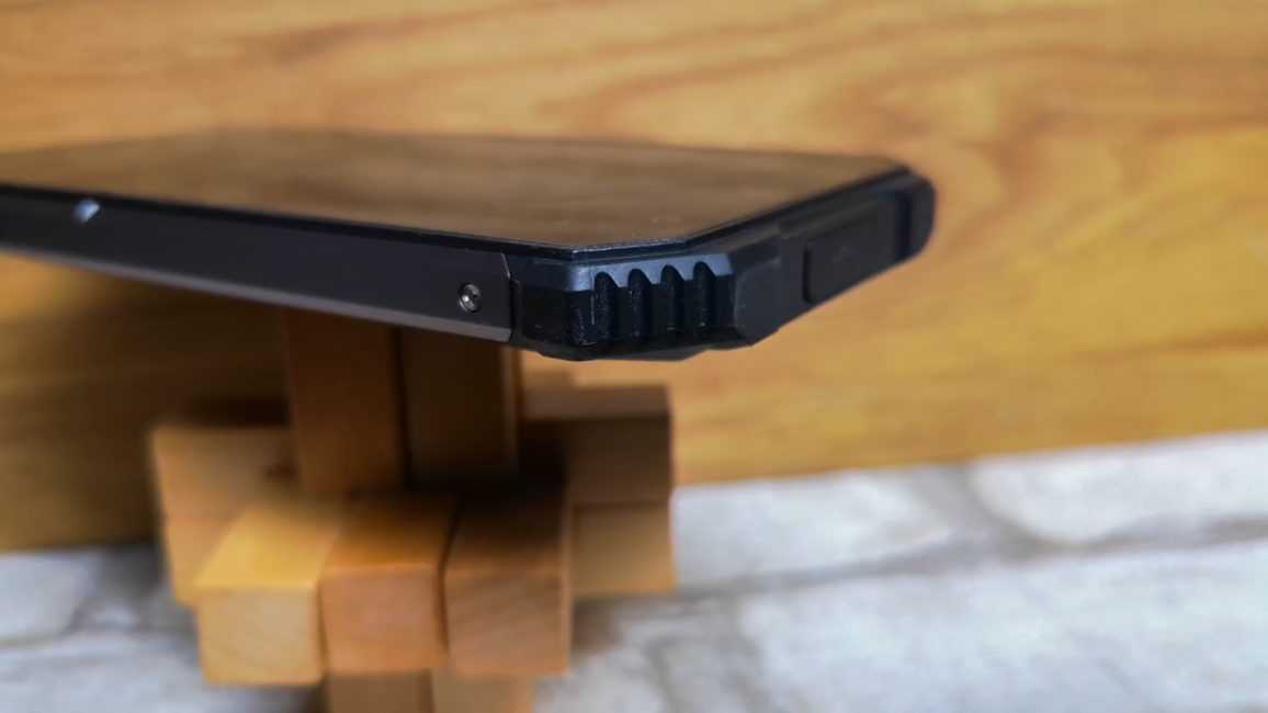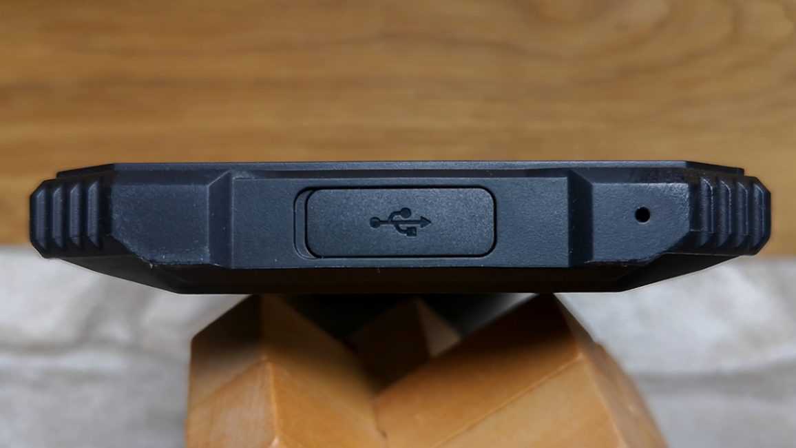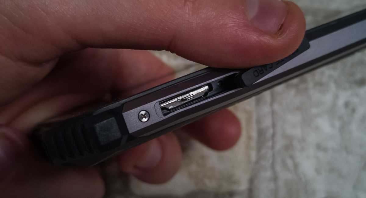 Слева на торце расположился слот для карты памяти и SIM-карты. Он специфический, прикрытый резиновой заглушкой, и достать его просто ногтём не получится.
