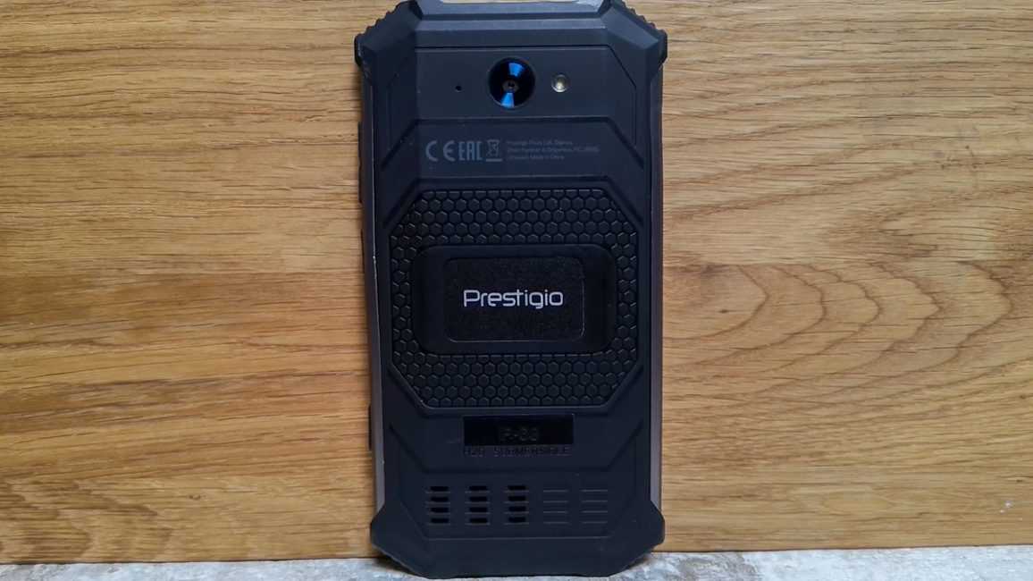 Сзади находится основная камера со вспышкой, чуть ниже — информация о сертификации. Ещё ниже — лого Prestigio, под ним — надпись IP68 и решетка мультимедийного динамика.