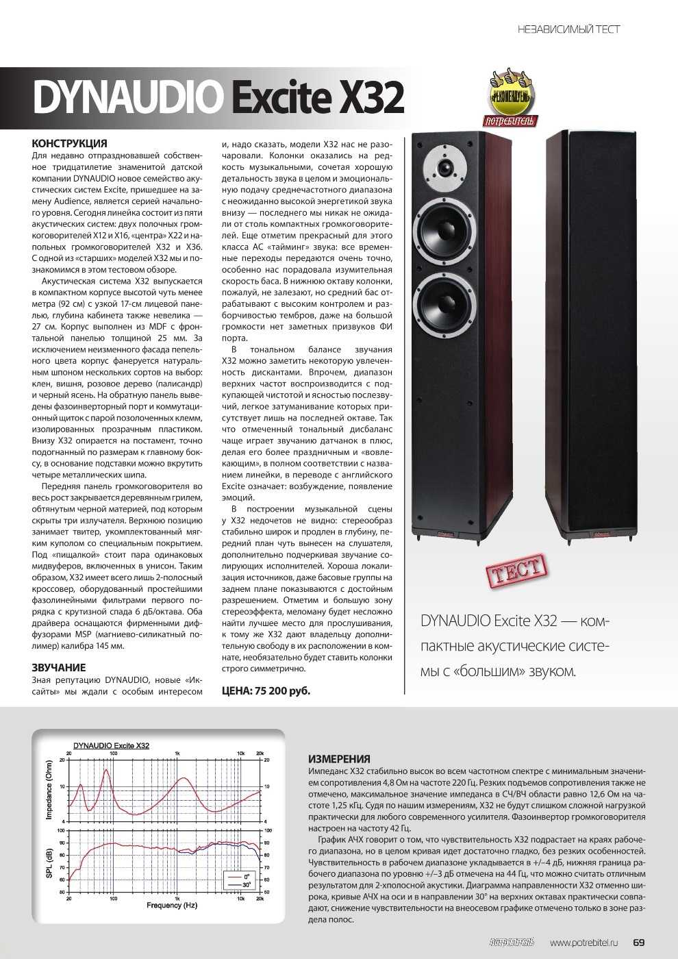 Импеданс Х32 стабильно высок во всем частотном спектре с минимальным значением сопротивления 4,8 Ом на частоте 220 Гц. Резких подъемов сопротивления также не отмечено, максимальное значение импеданса в СЧ/ВЧ области равно 12,6 Ом на частоте 1,25 кГц. Судя по нашим измерениям, Х32 не будут слишком сложной нагрузкой практически для любого современного усилителя. Фазоинвертор громкоговорителя настроен на частоту 42 Гц.
