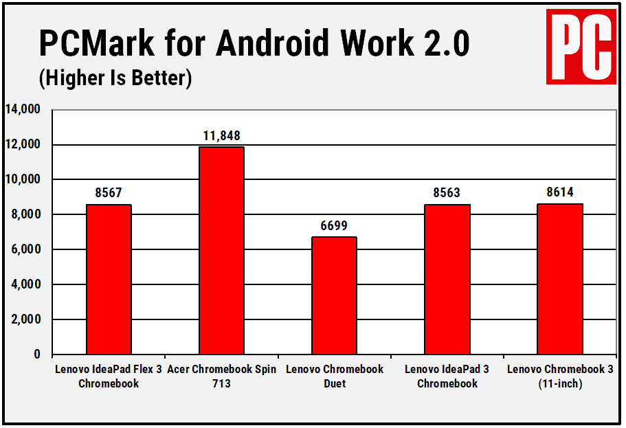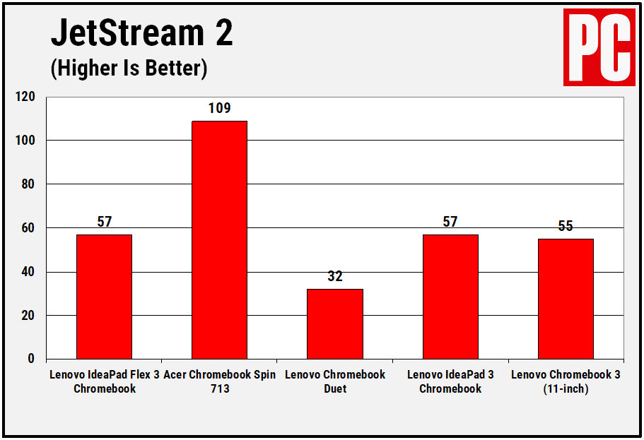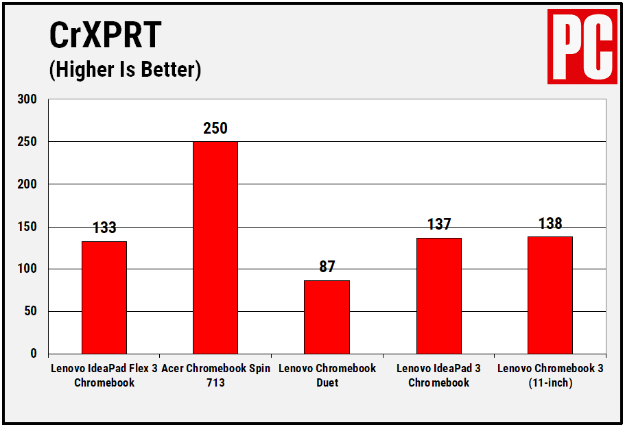 Во всех этих тестах Flex 3 значительно отстал от более дорогого и мощного Acer, примерно наравне со своим двоюродным братом без Flex и комфортно опередил Chromebook Duet (у которого есть особенно популярный процессор Mediatek ARM).