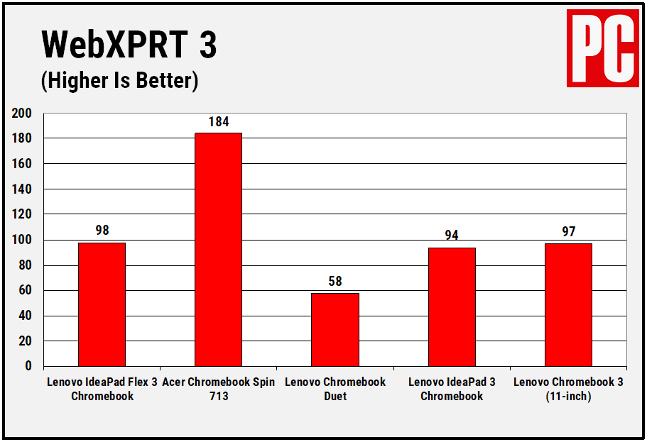 По нашим теоретическим тестам, Flex 3 работает примерно так, как ожидалось для Chromebook среднего уровня. В приведенных ниже таблицах я включил несколько альтернативных моделей по разным ценам. Версия IdeaPad 3 Chromebook без Flex стоит примерно так же, а Lenovo Chromebook 3 и Lenovo Chromebook Duet дешевле. С другой стороны спектра — Acer Chromebook Spin 713, победитель Выбор редакции в ценовом диапазоне от 600 долларов.