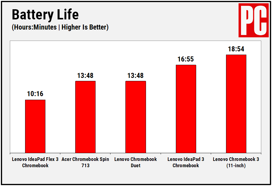 Время автономной работы Flex 3 достаточное. В нашем тесте на просмотр видео, который включает воспроизведение локально сохраненного видеофайла с отключенным Wi-Fi, он длился чуть более 10 часов. Это должно помочь вам в течение дня, когда вы время от времени просматриваете страницы, но для современного Chromebook это низкий уровень.
