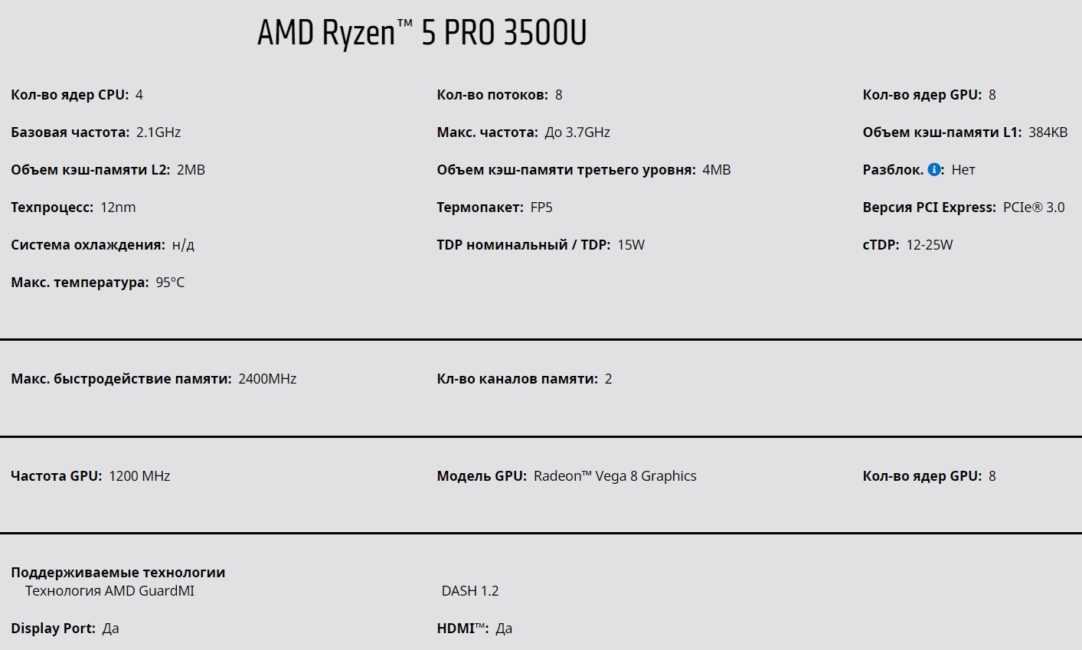 Теперь — начинка. AMD Ryzen 5 Pro 3500U. Да, не обычный, а PRO, но разница мизерная. Четыре ядра, восемь потоков, частота от 2,1 ГГц до 3,7 при автобусте. Поддержка памяти — двухканал до 2400 МГц, кэш первого/второго/третьего уровня — 384 КБ/ 2 МБ/ 4 МБ. Встроенное видеоядро — AMD Radeon RX Vega 8. Соответственно, 8 графических ядер, работающих на частоте до 1200 МГц. И, что важнее всего, TDP процессора всего 15 Вт.