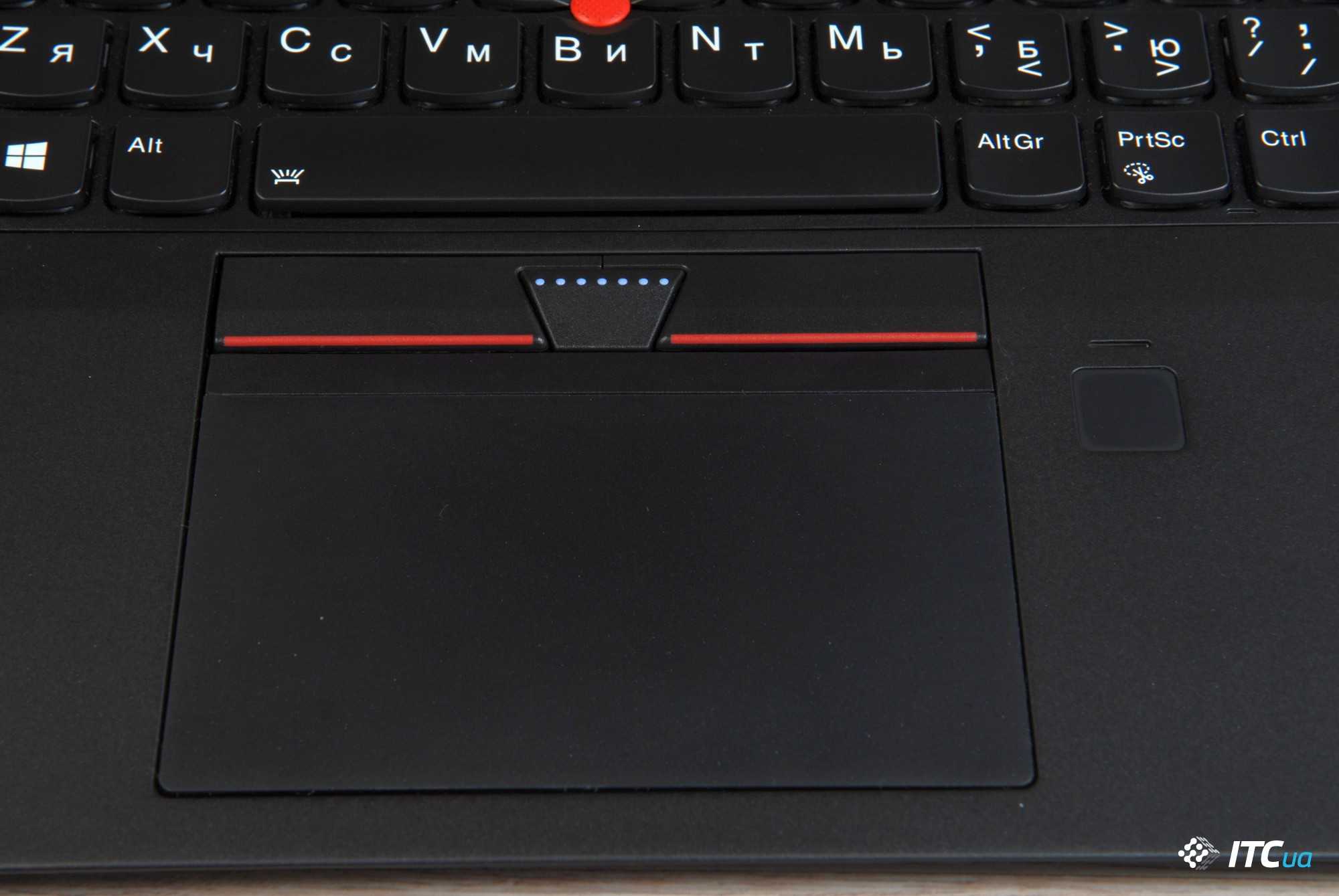 Название серии говорит о том, что устройство оснащено классической клавиатурой от Lenovo: кнопки ThinkPad имеют углубленную форму, нажимаются легко, имеют достаточно долгий ход. Справа от клавиатуры расположена полоска сканера отпечатков пальцев: для активации ультрабука по сканеру нужно провести подушкой пальца.