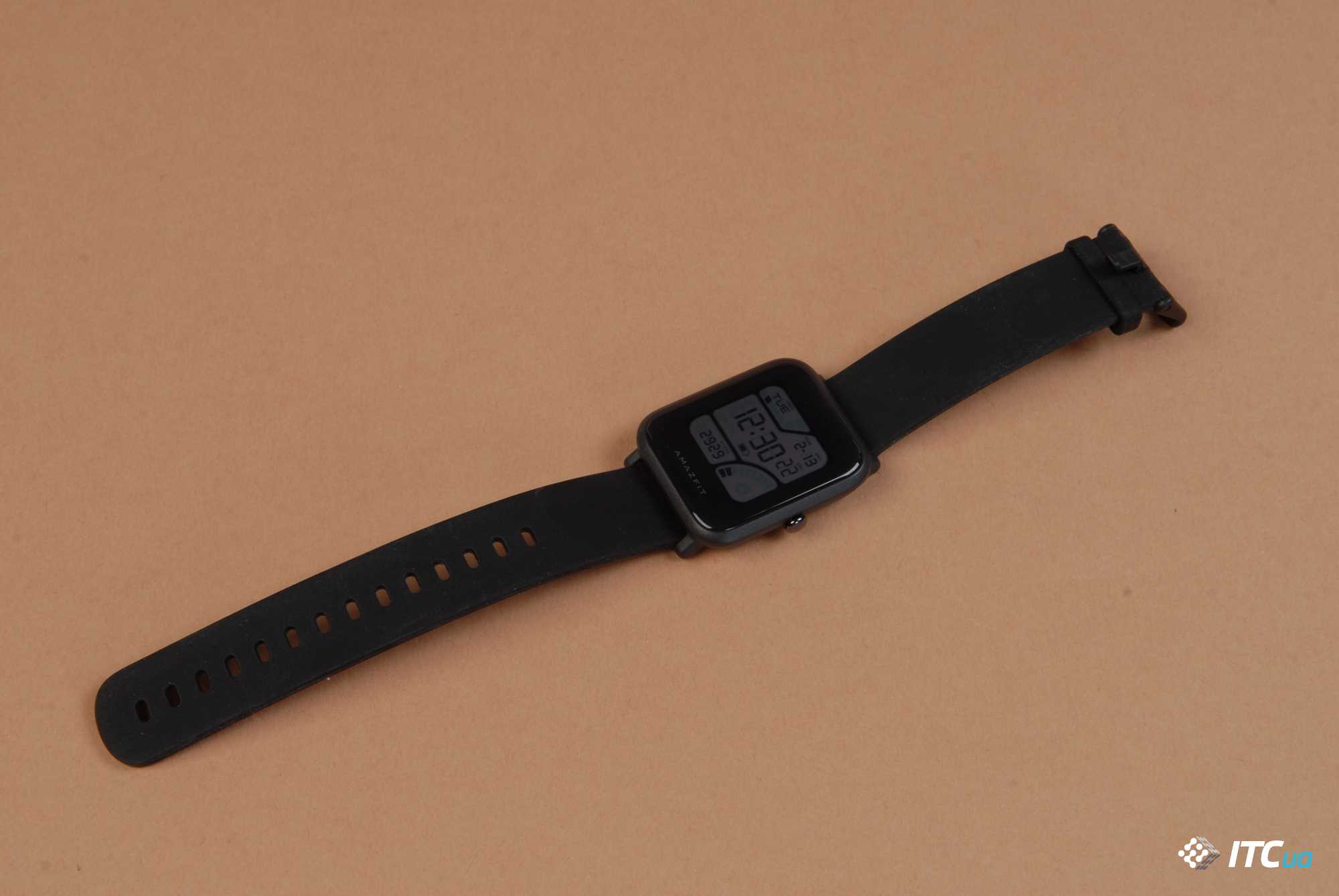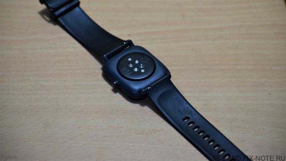 Комплектный ремешок выполнен из резины, в нашем случае она черного цвета. Он удобный, мягкий и во время тренировок не парит кожу. Ремешок регулируемый по длине и его будет достаточно для разных по длине запястий. Ширина ремешка составляет 20 мм и он съемный, крепление стандартное для часов.