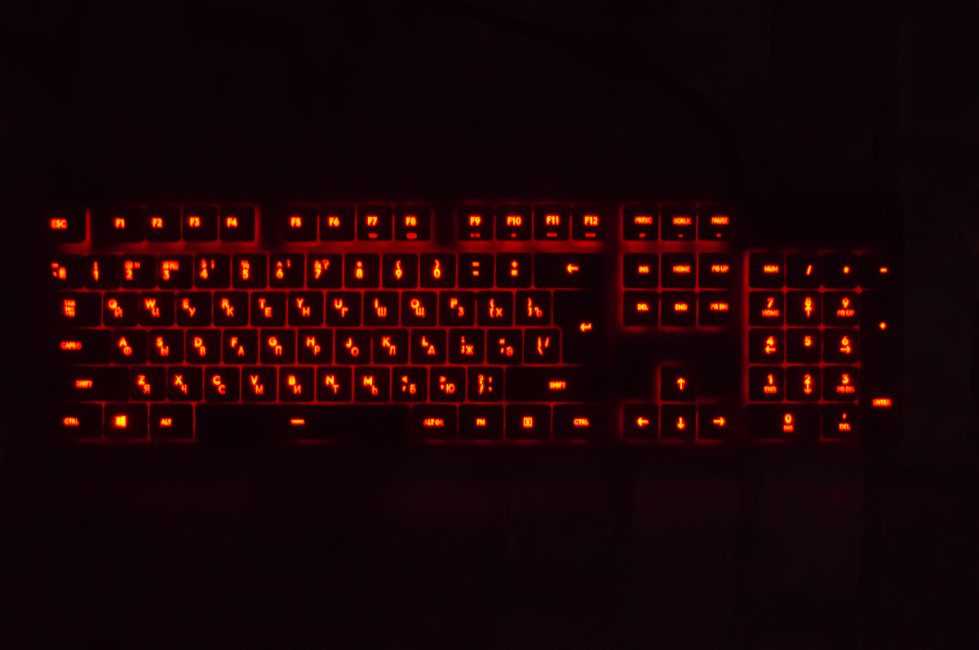 Девайс оснащен RGB-подсветкой, цвет и яркость которых можно настраивать непосредственно с самой клавиатуры. Шрифт клавиш выбран нестандартный. Для тех, кто владеет слепой печатью, это проблем не составит, а вот для неподготовленных пользователей может увеличить время поиска нужной кнопки. Надписи выполнены за счет выреза, поэтому беспокоиться об истирании не придется. Дополнительных клавиш нет.