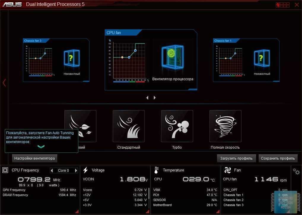 Особого внимания заслуживает возможность настроить работу системы охлаждения вашего ПК в соответствии с предпочитаемым профилем эксплуатации. Утилита Q-Fan Tuning позволяет настроить каждый кулер по отдельности либо выбрать один из 4 режимов: