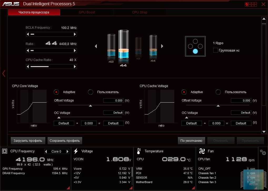 Воспользовавшись утилитой ASUS AI Suite 3, нам удалось разогнать процессор до частоты в 4,4 ГГц, при этом напряжение питания автоматически повысилось c 1,072 до 1,3 В. Прирост тактовой частоты составил 1,2 ГГц (40% по сравнению с номинальной). В ручном режиме процессор поддался лучше, и мы успешно взяли планку в 4,7 ГГц при напряжении в почти 1,5 В.