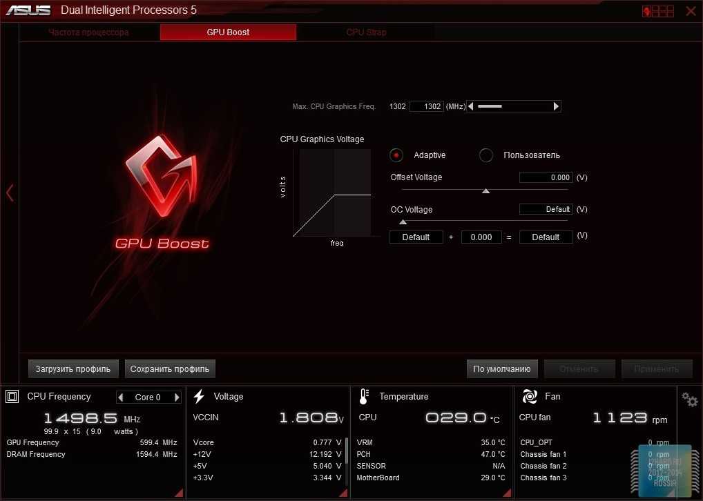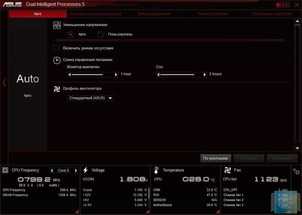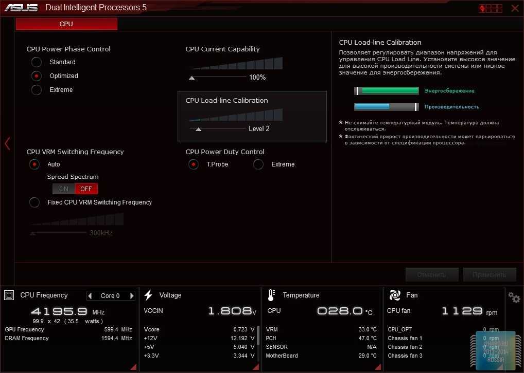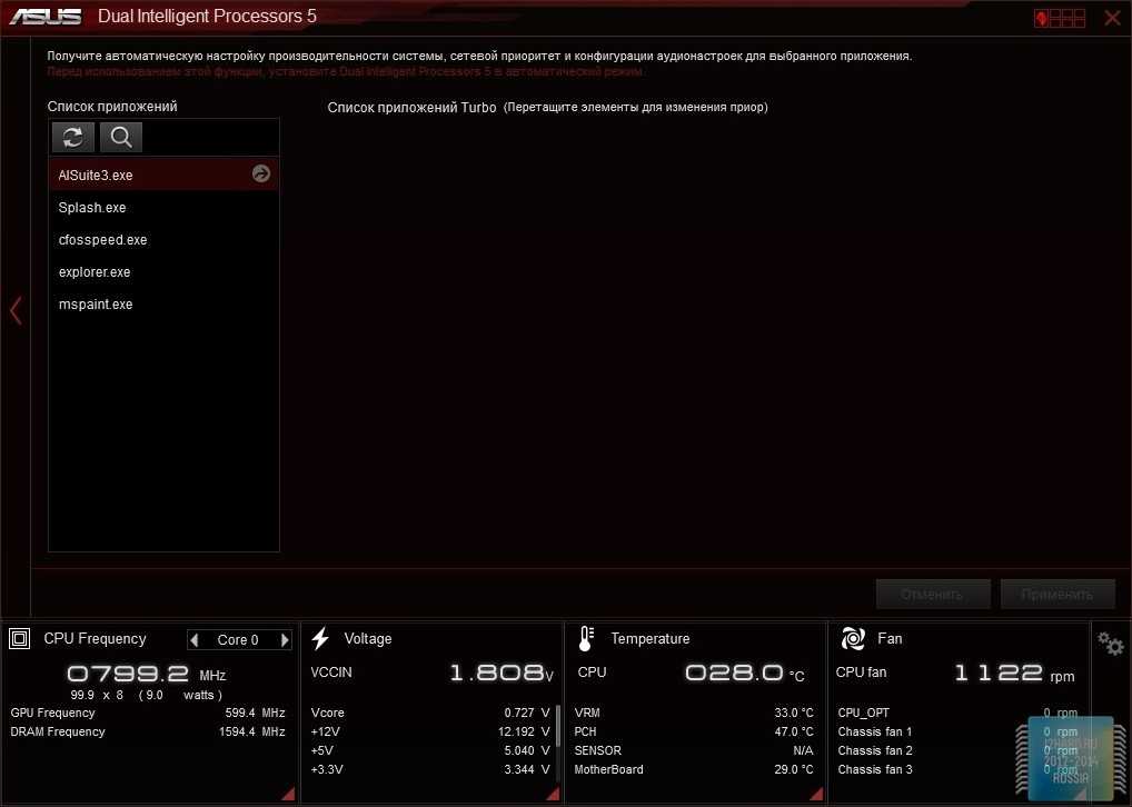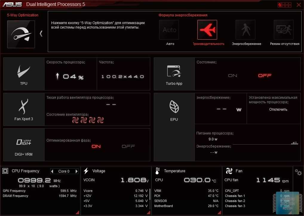 Основной утилитой программного пакета ASUS AI Suite 3 является Dual Intelligent Processor 5. Цифра пять в названии символизирует число основных разделов, далее рассмотрим некоторые из них.