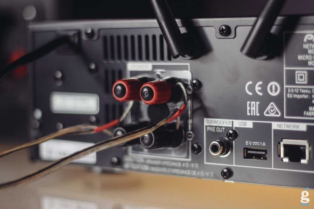Точно такие же клеммы (в количестве четырёх штук – по две на канал) с винтовыми зажимами находим мы и на тыловой стороне основного блока. Рядом с ними располагается монофоническое гнездо предварительного выхода для сабвуфера. То есть, у Pioneer X-HM76 есть опция, позволяющая расширить базовую акустику с формулы 2.0 до 2.1 – пускай и с помощью стороннего низкочастотного динамика.