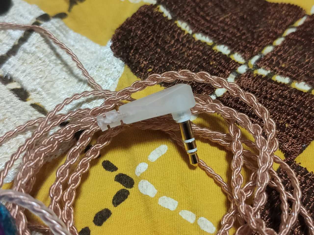 Провод сделан сменным, используются немного необычные коннекторы. Точнее, сами двухпиновые вилки, конечно, стандартны, а вот гнёзда на наушниках расположены на небольшом выступе, в свою очередь коннекторы сделаны с кантом, таким образом обеспечивается «бесшовное» соединение. На самом деле, подключить к наушникам получится любую подходящую вилку, но смотреться эстетично это всё будет только с родным кабелем. Впрочем, сам провод, идущий в комплекте очень хорош. Он мягкий, практически не запутывается и не твердеет на морозе, микрофонный эффект отсутствует. Кроме того, этот кабель ещё и очень красив: ровное плетение, удачный выбор оттенка — всё сделано в соответствии с «феншуем».