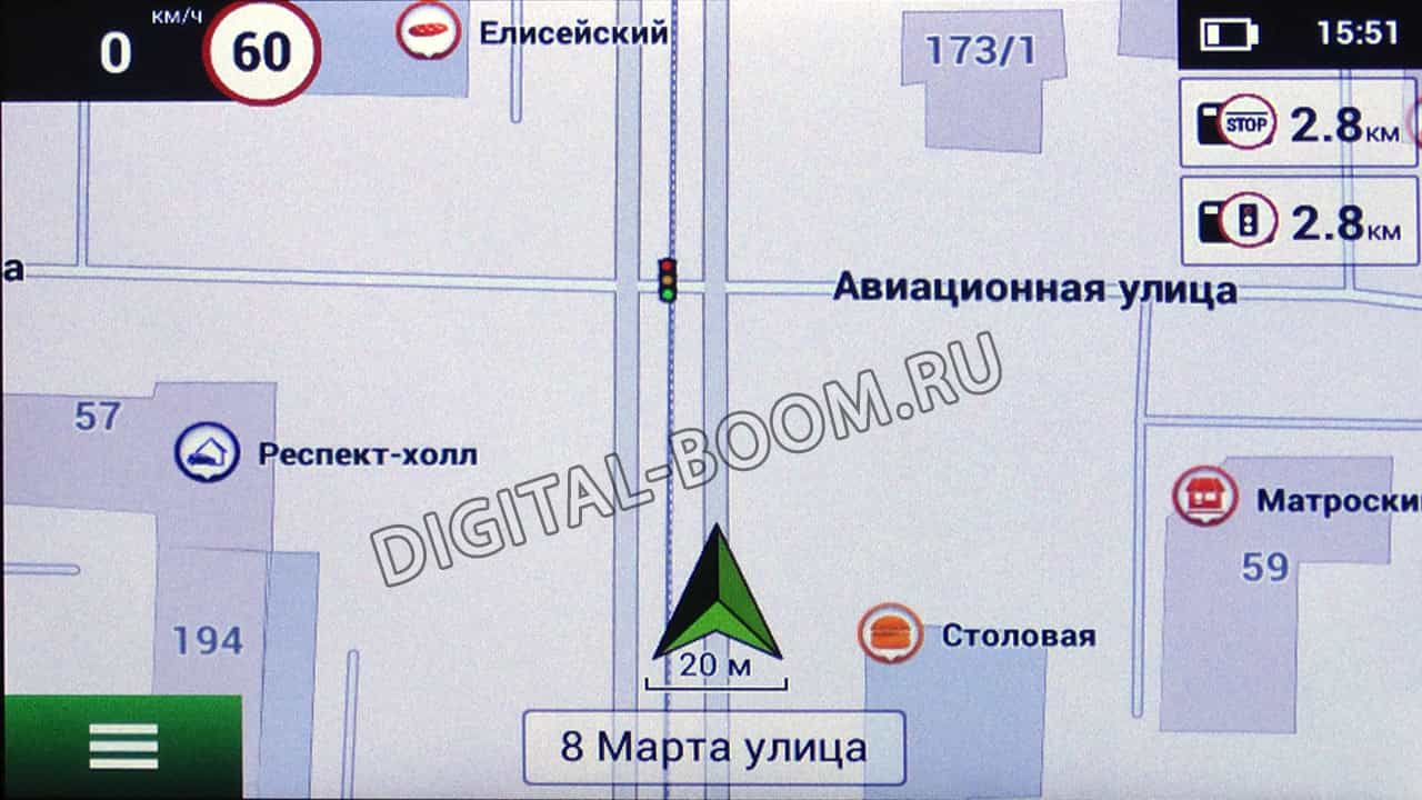 В левом нижнем углу кнопка «меню», где вы сможете настроить параметры навигатора и построить маршрут. Маршруты, кстати, можно сохранять и использовать повторно, если это ваш частый маршрут.