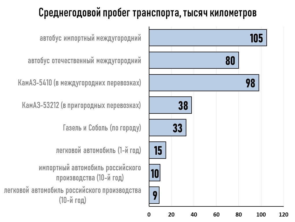 И эти цифры есть, они вполне официальны. В 2013 году Министерство юстиции подготовило исследование транспортных средств, чтобы им руководствовались при судебной экспертизе. И, кроме прочего, там есть информация о средних пробегах транспорта. Средние годовые пробеги там указаны такие: