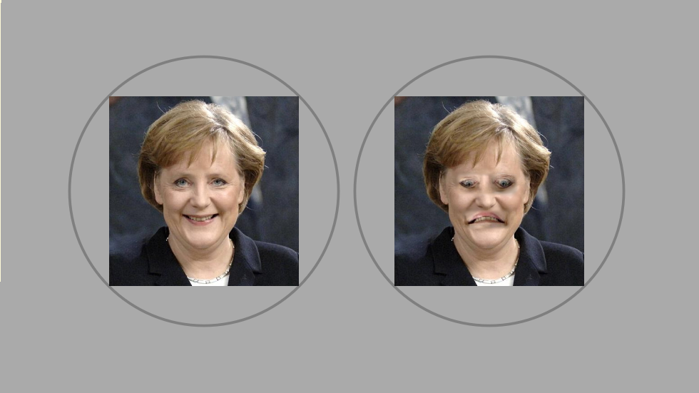 Между изображениями Ангелы Меркель на картинке выше нет почти никакой разницы, верно? Кажется, что на них она просто смотрит в разные стороны, и на том, что справа улыбка какая-то странная. Всё сильно меняется, если их перевернуть.