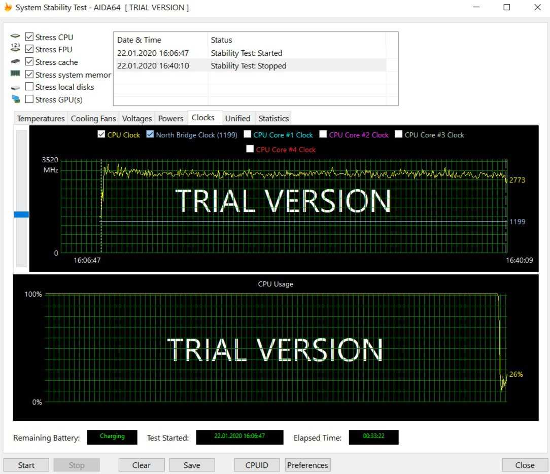 Но тестирование производительности центрального процессора с длительной нагрузкой при запуске программы для численного моделирования дает другой результат. Разница между максимальным и минимальным быстродействием в различных режимах запуска (с подключением к сети и без, с полностью заряженным и частично разряженным аккумулятором и т.д.) составляет до 1.5 раза. Причем минимальный показатель фиксируется при подключении к сети с частично разряженным аккумулятором.