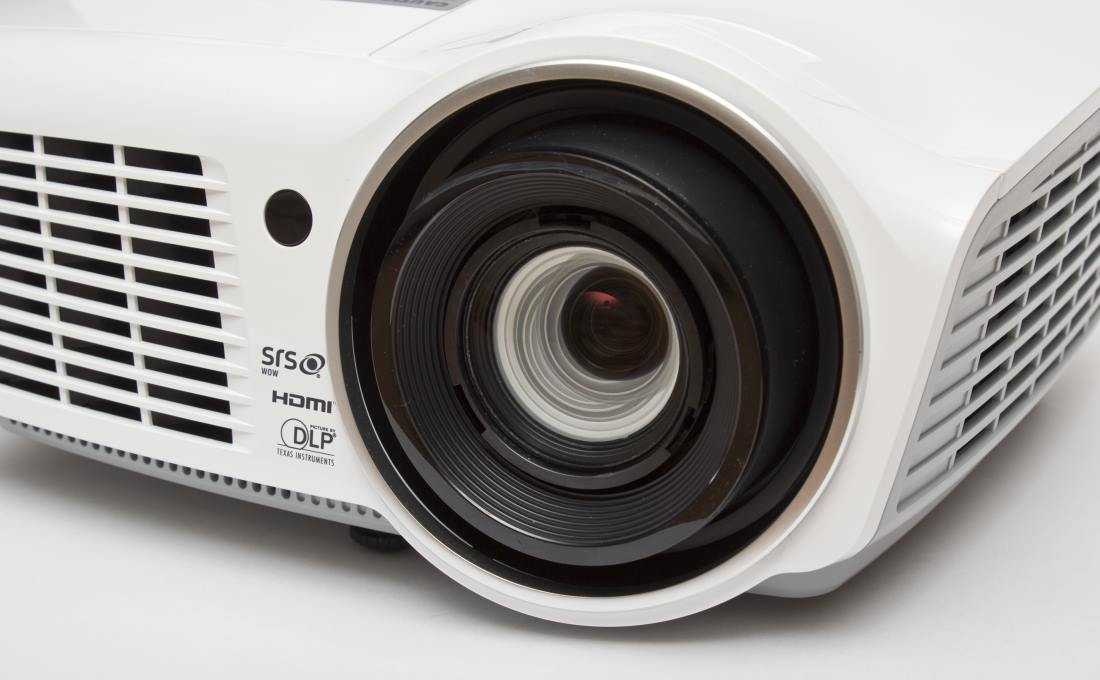 По бокам у проектора – стильные и функциональные решетки, увеличенные по сравнению с предыдущей модификацией H1180. Через эти «легкие» выдыхается теплый воздух, продуваемый от лампы мощностью 160-190 Вт. Система охлаждения явно спроектирована с большим запасом, чтобы условия эксплуатации с лампой накаливания были менее требовательными.