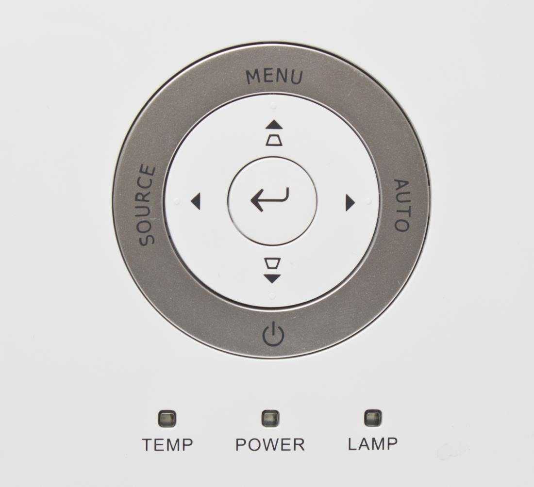 Если проектор пропишется на столе или, как летучая мышь, зависнет вниз головой, на корпусе будут доступны основные кнопки управления и три световых сигнала: включен в сеть, смени лампу, я перегрелся.
