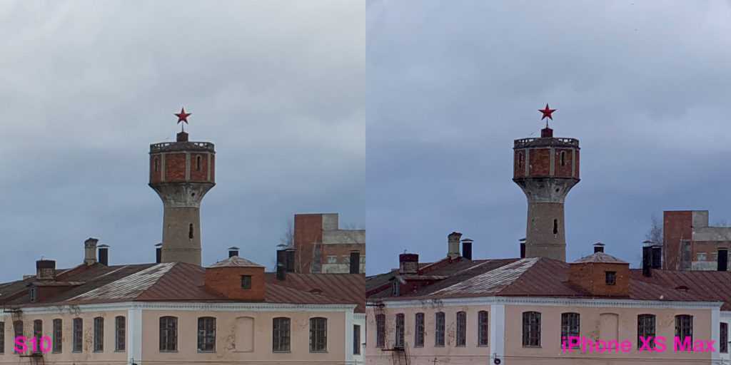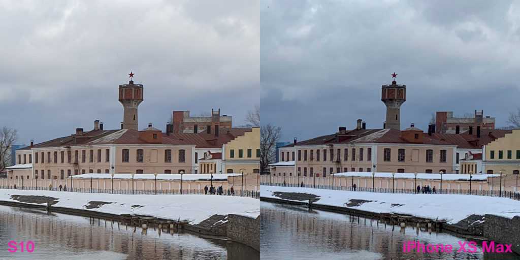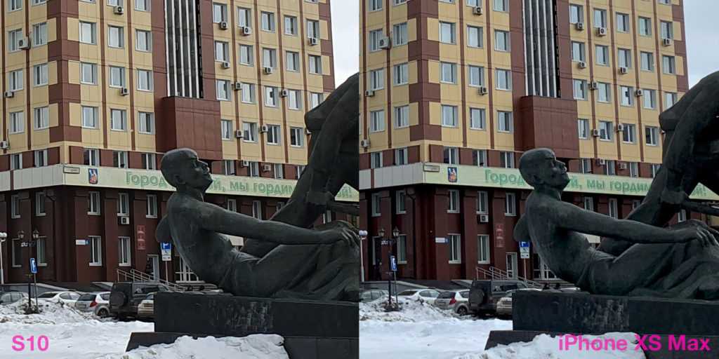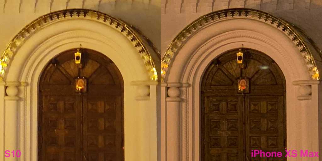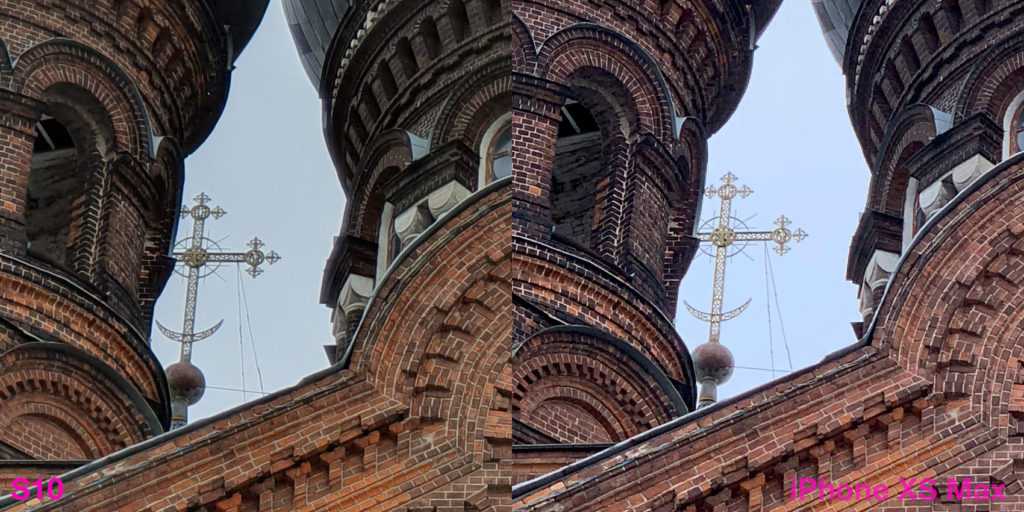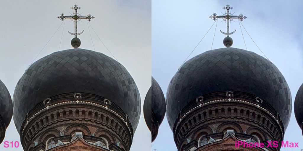 Может показаться, что картинка с iPhone более рыхлая. Но это вопрос терминологии. На S10 главенствует шумодав, который наглухо убирает шумы и резкость. Заодно. Тем самым, фактура поверхностей, миниатюрные элементы архитектуры — всё идёт под нож алгоритмов Samsung. Тоже подход, почему нет. Правда, страдает детализация, хотя не могла бы.