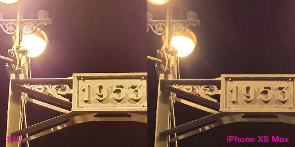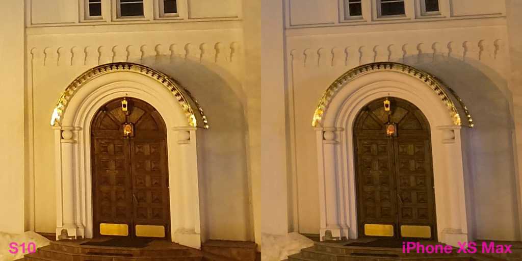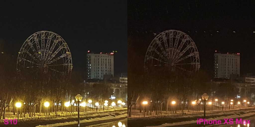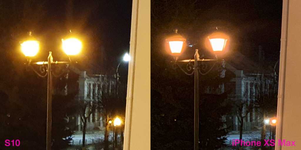 Сравнение ночных снимков только укрепляет лидерство iPhone. Тут и детализация выше, и засветов от ночных фонарей меньше. А это, если помните, отличительная черта новых «яблочных» флагманов. На обычной десятке засветы были. Такие же, как сейчас на S10.
