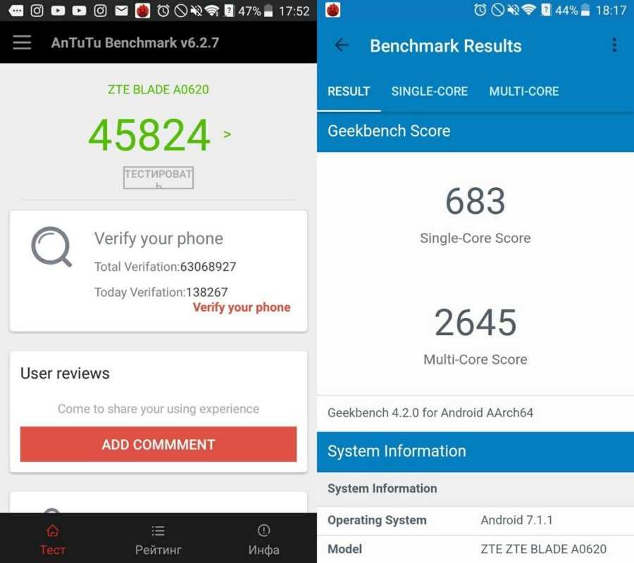 Исходя из невысокой стоимости, от ZTE Blade A7 Vita наивно было бы ждать идеальной мощности в работе. Именно поэтому здесь лучше всего рассматривать уровень производительности на примере запуска таких приложений, как, например, Telegram или WhatsApp.