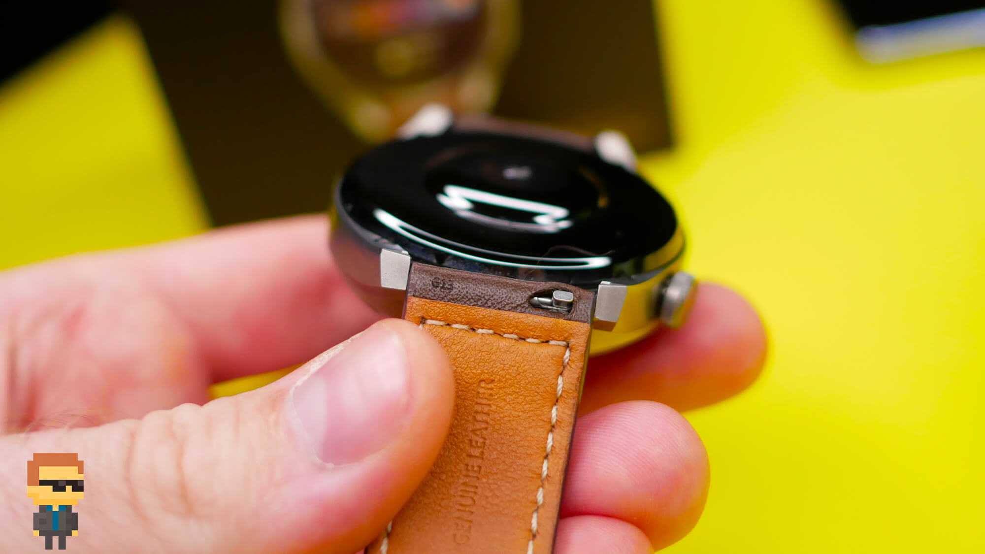 Презентабельности устройству добавляет черный ремешок из натуральной кожи. Синхронизация со смартфоном происходит посредством беспроводной технологии Bluetooth. Благодаря этому, пользователь может получать уведомления на смарт-часы, не используя телефон.