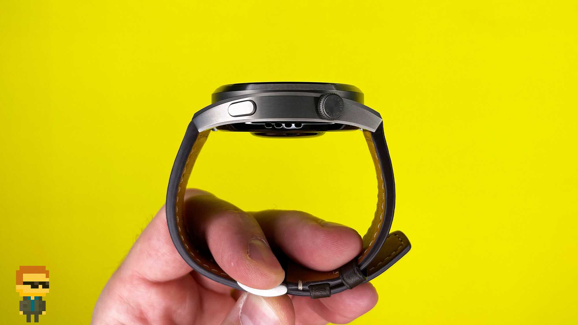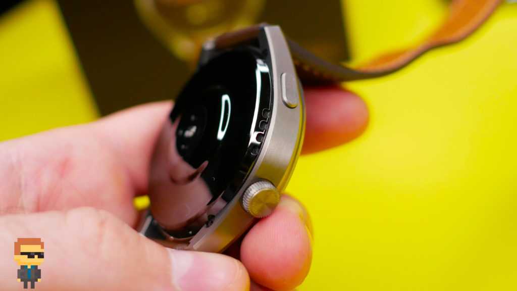 На правом торце корпуса расположено колесико с гравировкой «Huawei Watch». Классический и привычный элемент управления часами с новым смыслом. Работает как кнопка, но может использоваться для регулировки масштаба экрана.