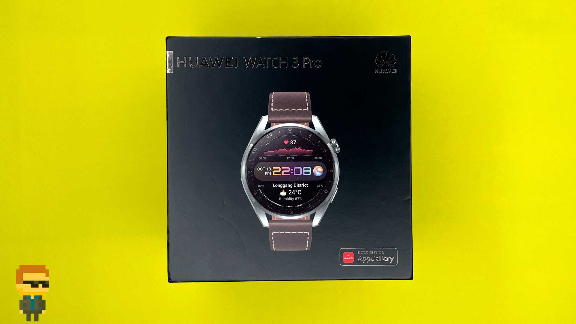 На стильной черной коробке золотистым тиснением нанесены логотип Huawei, полное название модели, а также источник приложений — AppGallery.