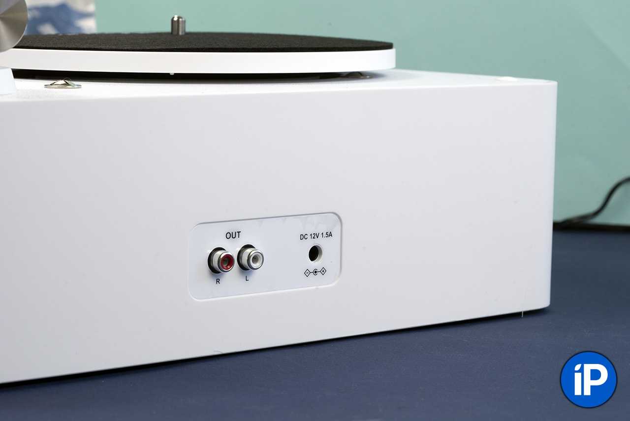 На задней стенке корпуса можно найти вход для кабеля питания и два «тюльпана» для подключения проигрывателя к более громкой колонке, например.