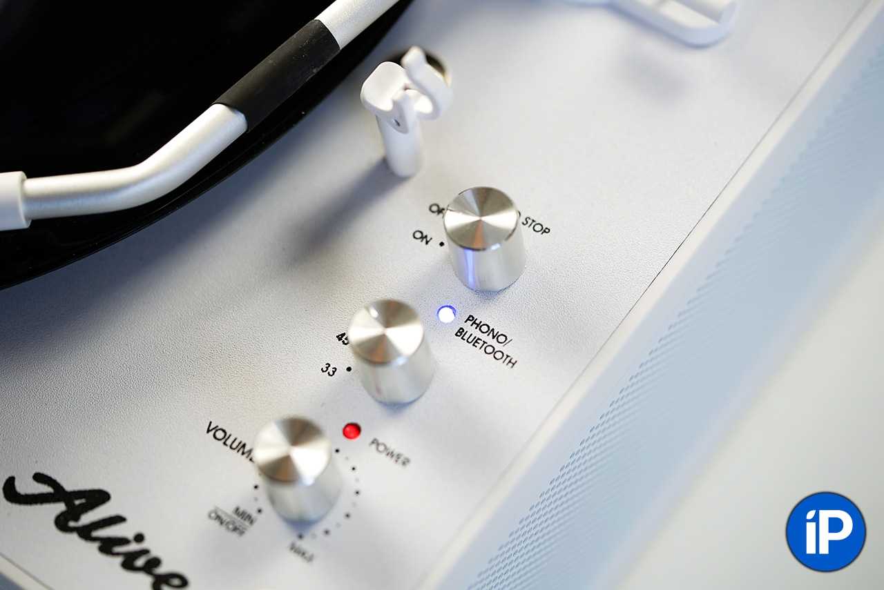 Рядом с поворотным тонармом есть три «крутилки», которые отвечают за громкость, скорость воспроизведения, активацию Bluetooth и включение-выключения функции автоматической остановки проигрывателя.