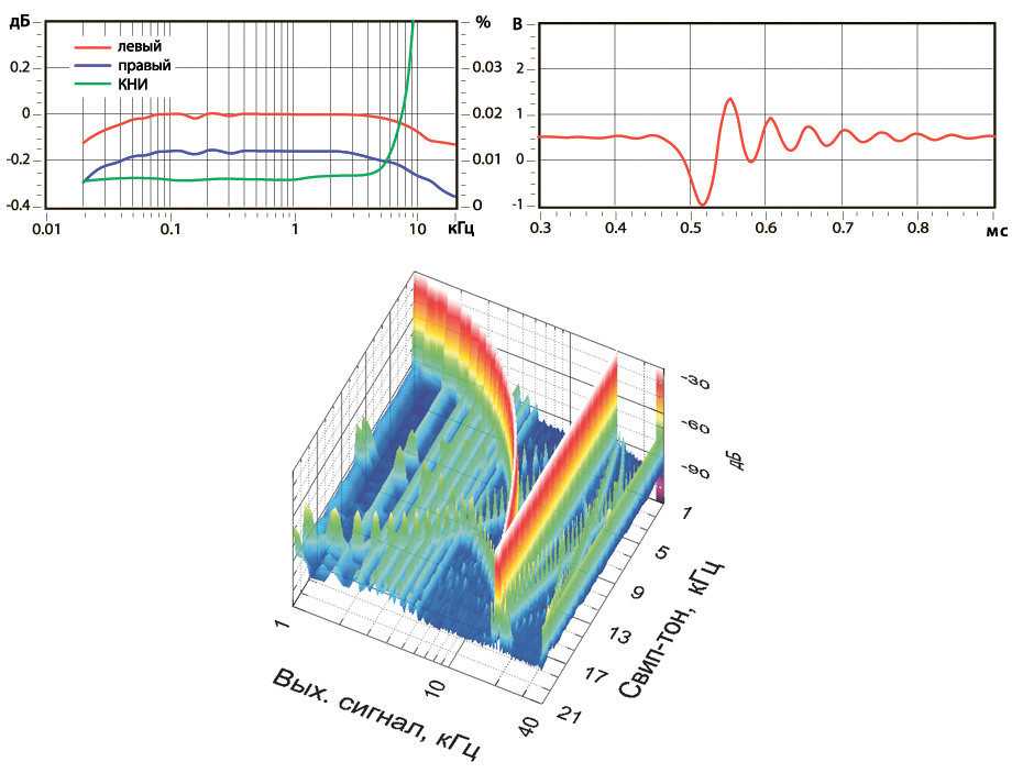 АЧХ встроенного ЦАПа не вызывает нареканий: провисание на краях диапазона минимально, дисбаланс по каналам недотягивает даже до 0,2 дБ. Вместе с тем настораживает резкий рост КНИ на частотах выше 6 кГц (максимальная величина этого показателя превышает опорную на 1 кГц почти в 50 раз!) и довольно странный отклик на одиночный импульс (даже не сразу поймешь, что фаза входного сигнала инвертируется).